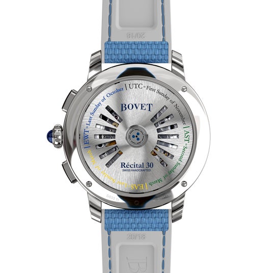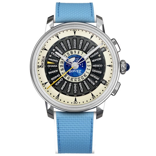 時計の歴史における大きな課題のひとつが サマータイム(DST/Daylight Saving Time)問題 でした。従来のワールドタイム機構では、世界120カ国の時間を正しく表示できず、70カ国以上が採用するサマータイムにも対応できないという根本的な問題がありました。この未解決の課題に対し、ボヴェはリサイタル 28 プロウエス 1 (GPHG2024でメカニカル・エクセプション賞を受賞)、そして、今回 受賞したリサイタル 30によって革新的な解決策を提示しました。2024年にリサイタル28で開発されたローラー式ワールドタイム機構をさらに進化させ、年間を通して世界中の時刻を正確に表示する初のワールドタイムとして設計されています。
