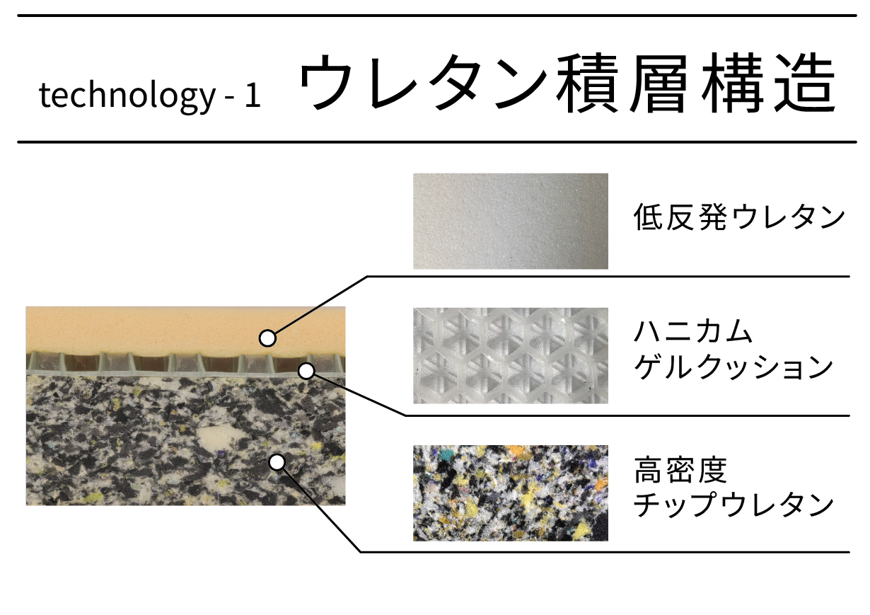 3層それぞれの厚みは何度もサンプルリングを行い、薄型でも底付きを感じにくくしています。