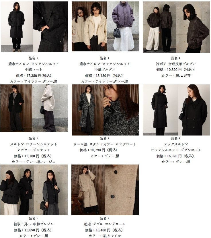 メルトン生地を使用し、長時間着用しても崩れにくい「テックメルトンビックシルエット ダブルコート」や今年のトレンドであるシャギー素材を使用した肉厚で高級感のある「起毛 ダブル ロングコート」のほか、袖の取り外しができ、ブルゾンだけでなくベストとしても活躍する「袖取り外し 中綿ブルゾン」など生地やデザインにこだわった商品が登場いたします。