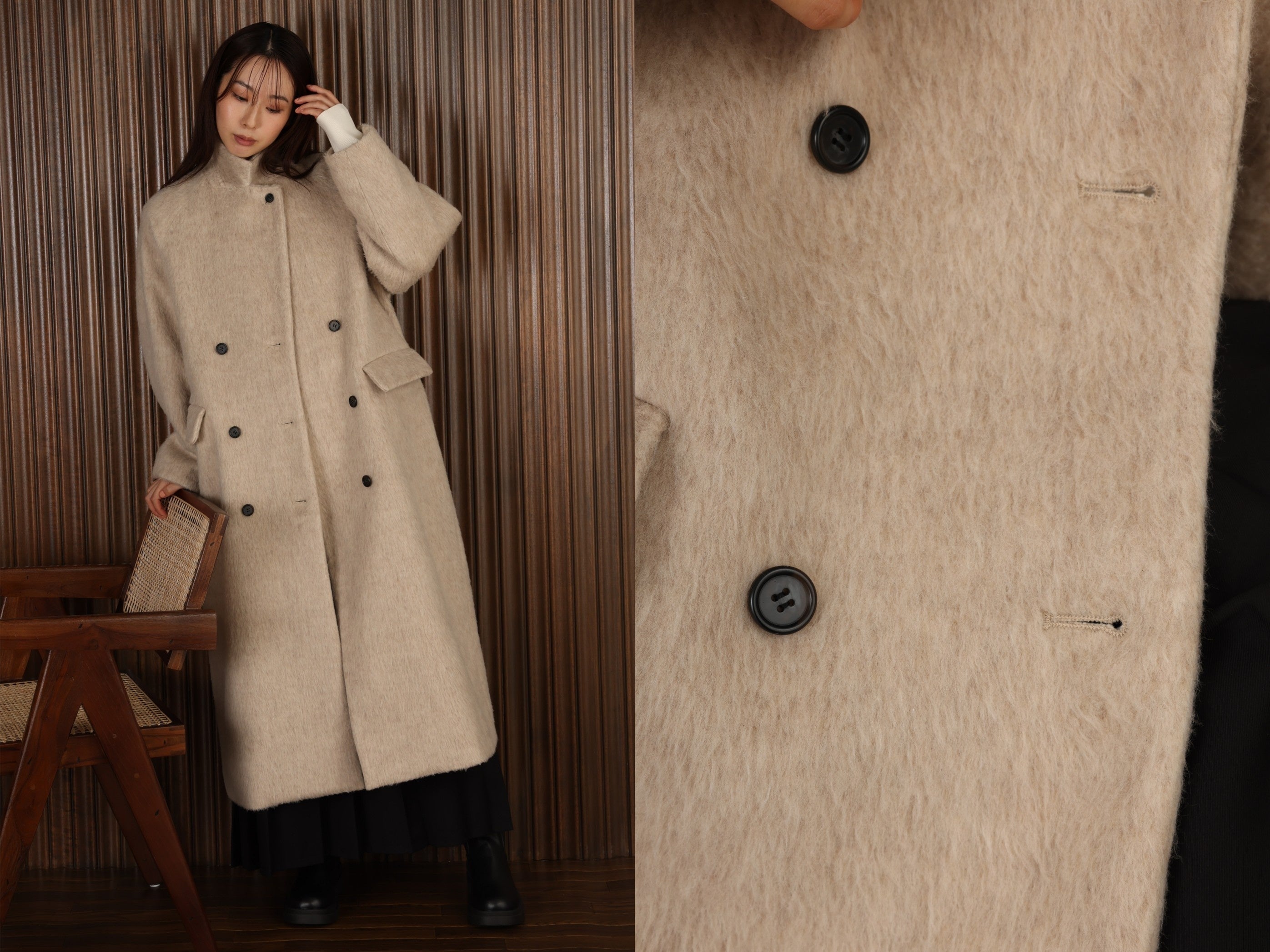ダブルのAラインコートで着丈も長めの設定です。センターベントは動くたびに裾が広がり綺麗なシルエットを作り出します。ラペルのボタンを上まで止めると、スタンド襟としてもお使い頂けます。