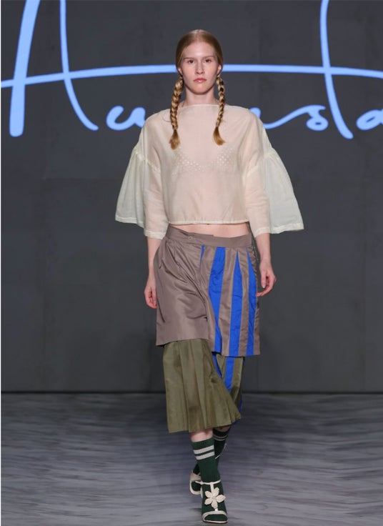 インド哲学の思想と文化にインスパイアされ生まれたブランド。 「身体とハートがくつろぐ」「遊び心」「喜びの循環」「地球との調和」をテーマに、インド西ベンガル州で女性たちが手仕事で仕立てる“ヴィンテージコットンカンタ”を中心に制作している。今季は、古布サリーを重ねて手刺しで仕立てる“カンタ”の持つ素材のエネルギーや色彩を活かし、“触覚のデザイン”をテーマに、刺繍や重ね布の豊かな質感でハンドクラフトの温もりを現代的に表現した。