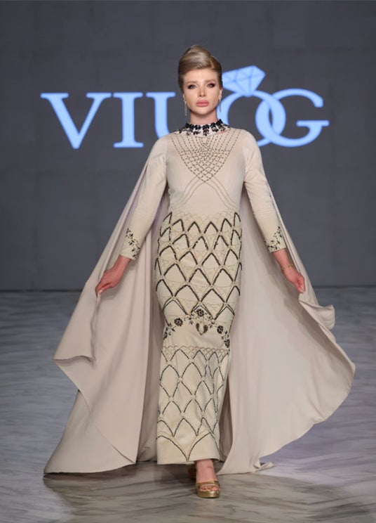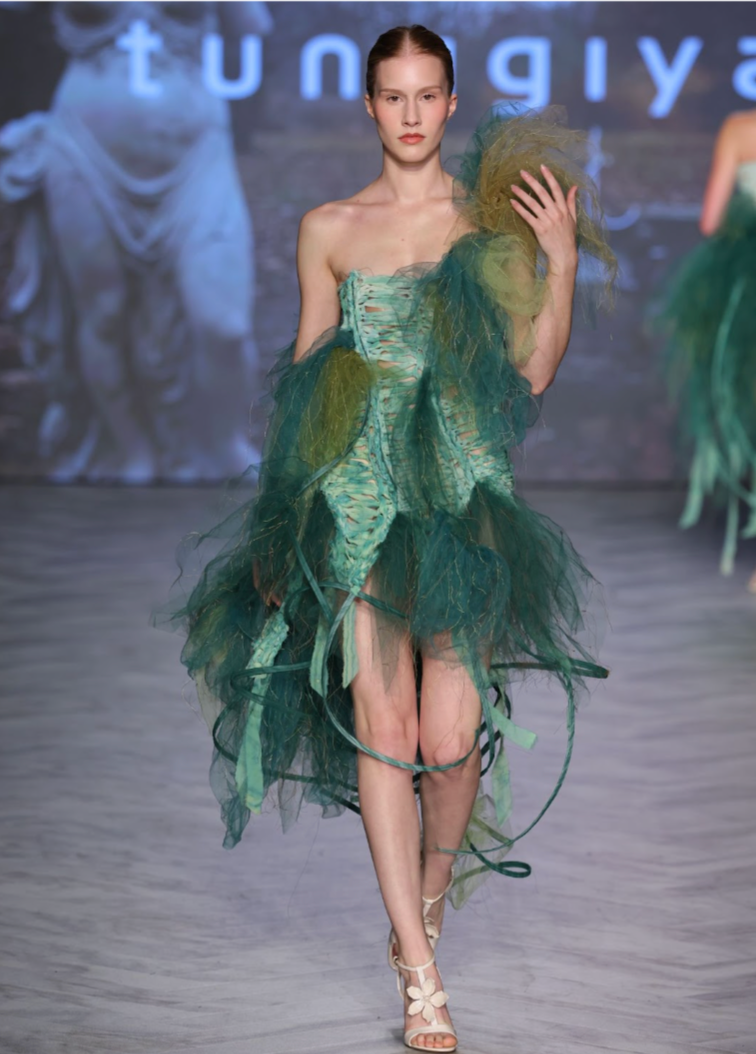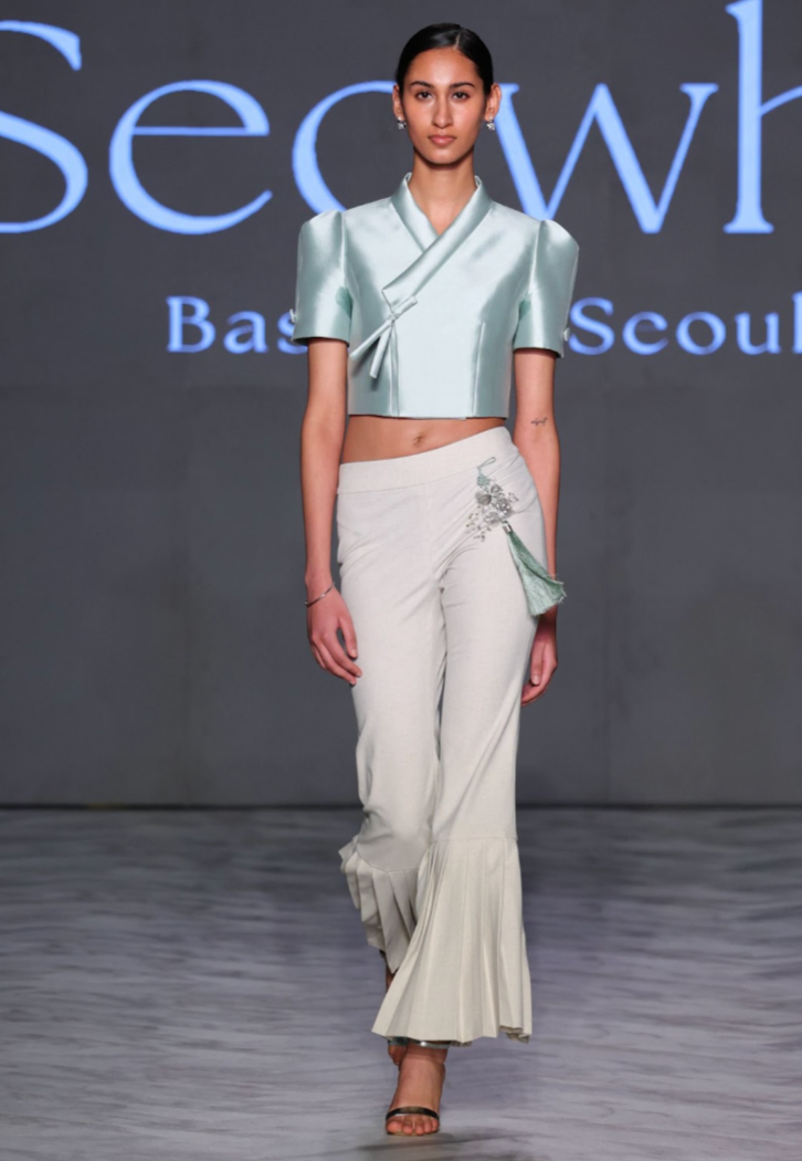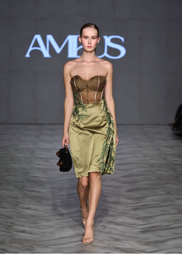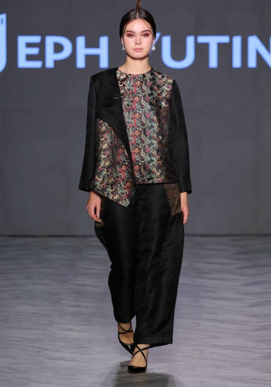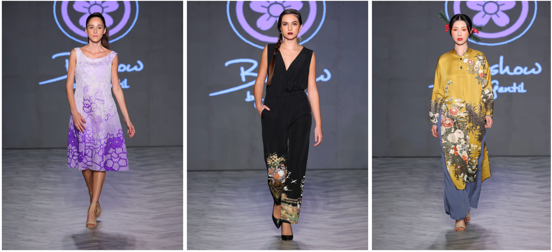 今季は、手作業で一色ずつ染め上げる手捺染の布地と、繊細な輝きを放つ金彩のディテールを用いた“モダンな伝統融合”を披露。色・柄・シルエットを通して着る人の自然な美しさを引き出すデザインを追求し、日常に深みと品格をもたらす装いを提案した。