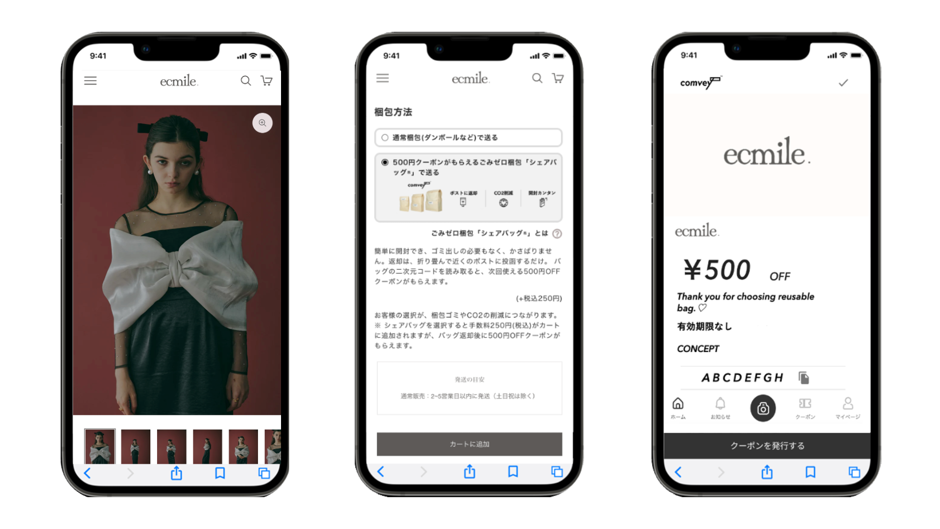 株式会社tashidelek.(本社:東京都渋谷区、代表取締役:北村 風優)が展開するアパレルブランド「ecmile.(エクミール)」は公式オンラインストアにて、株式会社comvey(コンベイ、本社:東京都中央区、代表取締役:梶田 伸吾)が提供する郵便ポストに返却できるごみゼロ梱包「シェアバッグ(R)︎」およびオペレーションシステムを2025年11月より導入開始いたしました。本サービスの導入により、利用者の梱包ストレスを解消できるほか、配送で発生する梱包ゴミを最小限に抑え、ダンボール回収やゴミ焼却時に発生するCO2排出量を85%以上削減、脱炭素化を推進することが可能となります。