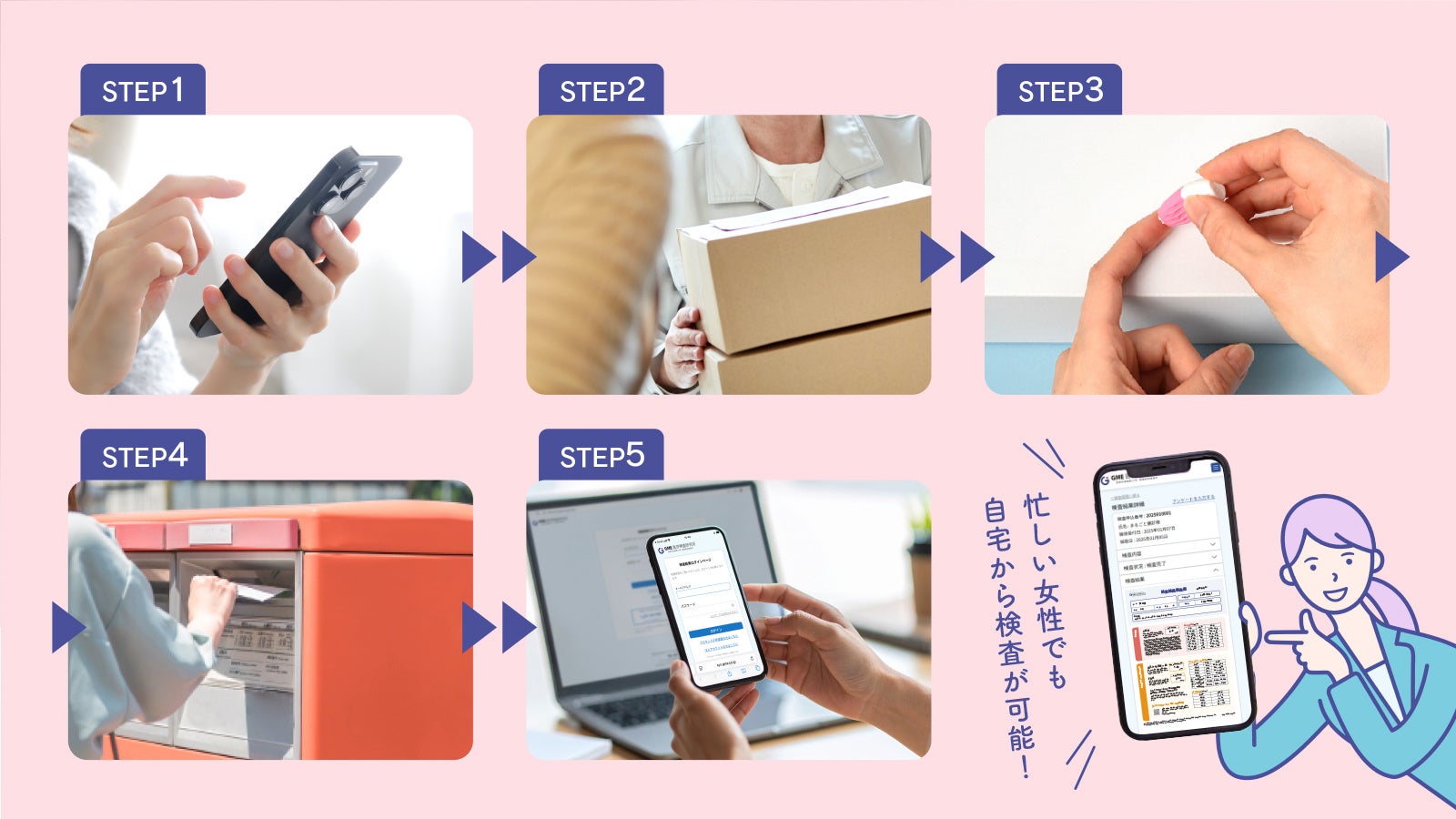 郵送検査サービスの利用フロー図 忙しい女性でも自宅から検査が可能!