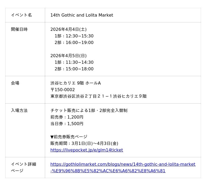 株式会社Gothic and Lolita Marketが主催する、ゴシック&ロリィタブランドが一同に会する国内最大級のプラットフォーム「Gothic and Lolita Market(以下、ゴスロリマーケット)」は、2026年4月4日(土)・5日(日)の2日間、渋谷ヒカリエ ヒカリエホールA(東京都渋谷区)にて第14回目のGothic and Lolita Marketを開催いたします。