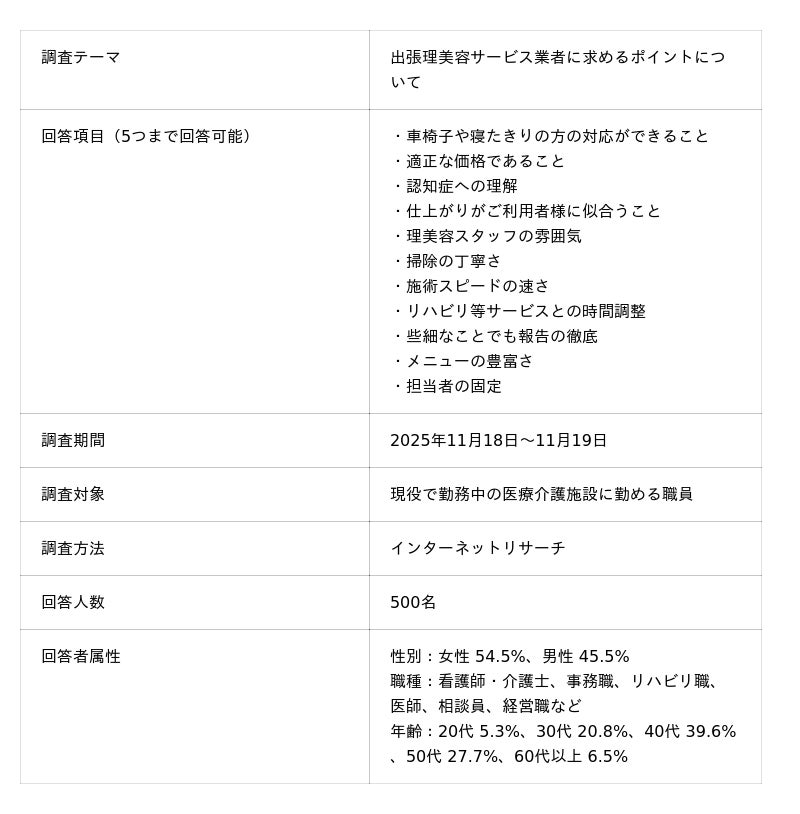 本調査は、実際に高齢者ケアの最前線で働く医療介護職員の方々に、出張理美容サービスに求めるポイントを尋ね、現場の実態とニーズを明らかにすることを目的として実施しました。