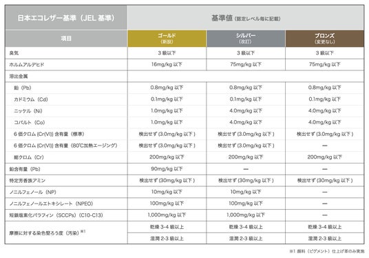 日本エコレザー認定(Japan Eco Leather (JEL))は、環境と人にやさしい革製品の選択肢をさらに広げるため、新たな一歩を踏み出しました。消費者のニーズに応え、「ゴールド」認定を新設しました。また、業界の近状を考慮してウェットブルーやクラストから製造した革や色違いの革も申請がしやすくなるよう改訂。さらにJELラベルのデザインも変更し、よりわかりやすい表示になりまし た。これらによって、多くの革が適切な評価を受けることが可能となり、日本エコレザーの選択肢が広がります。