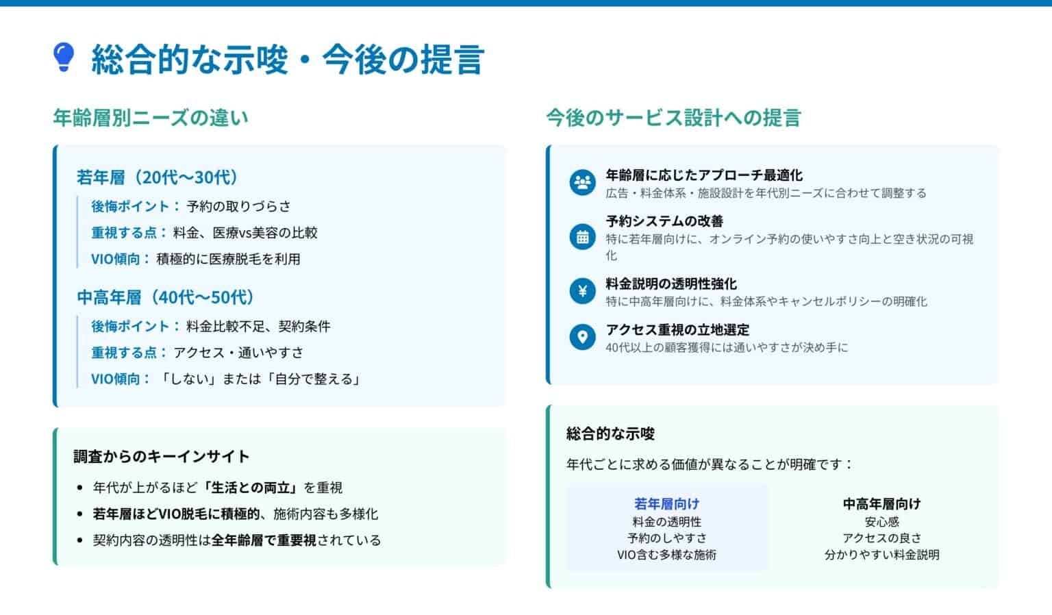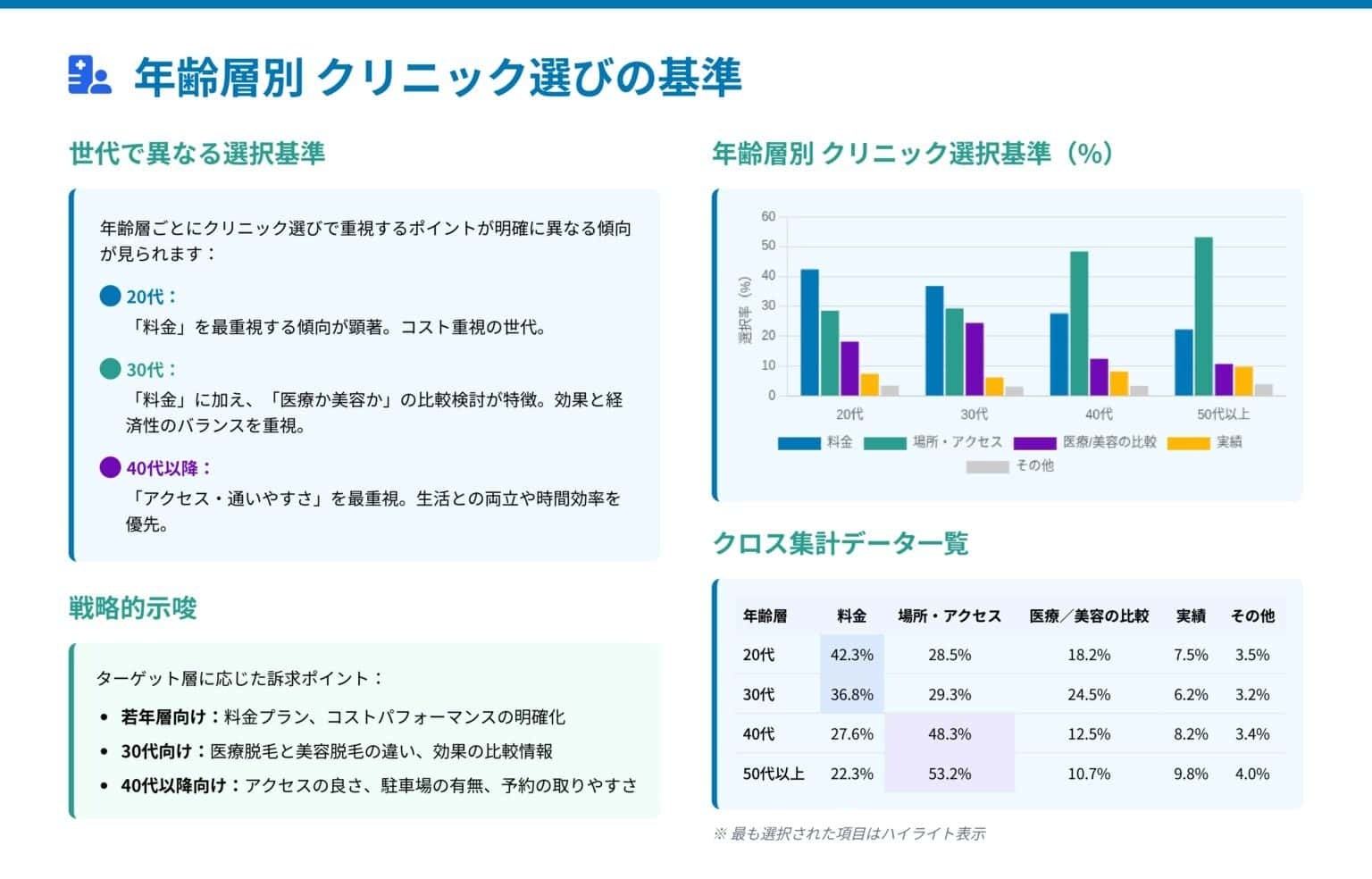 - 中高年層には「安心感・アクセス・分かりやすい料金説明」