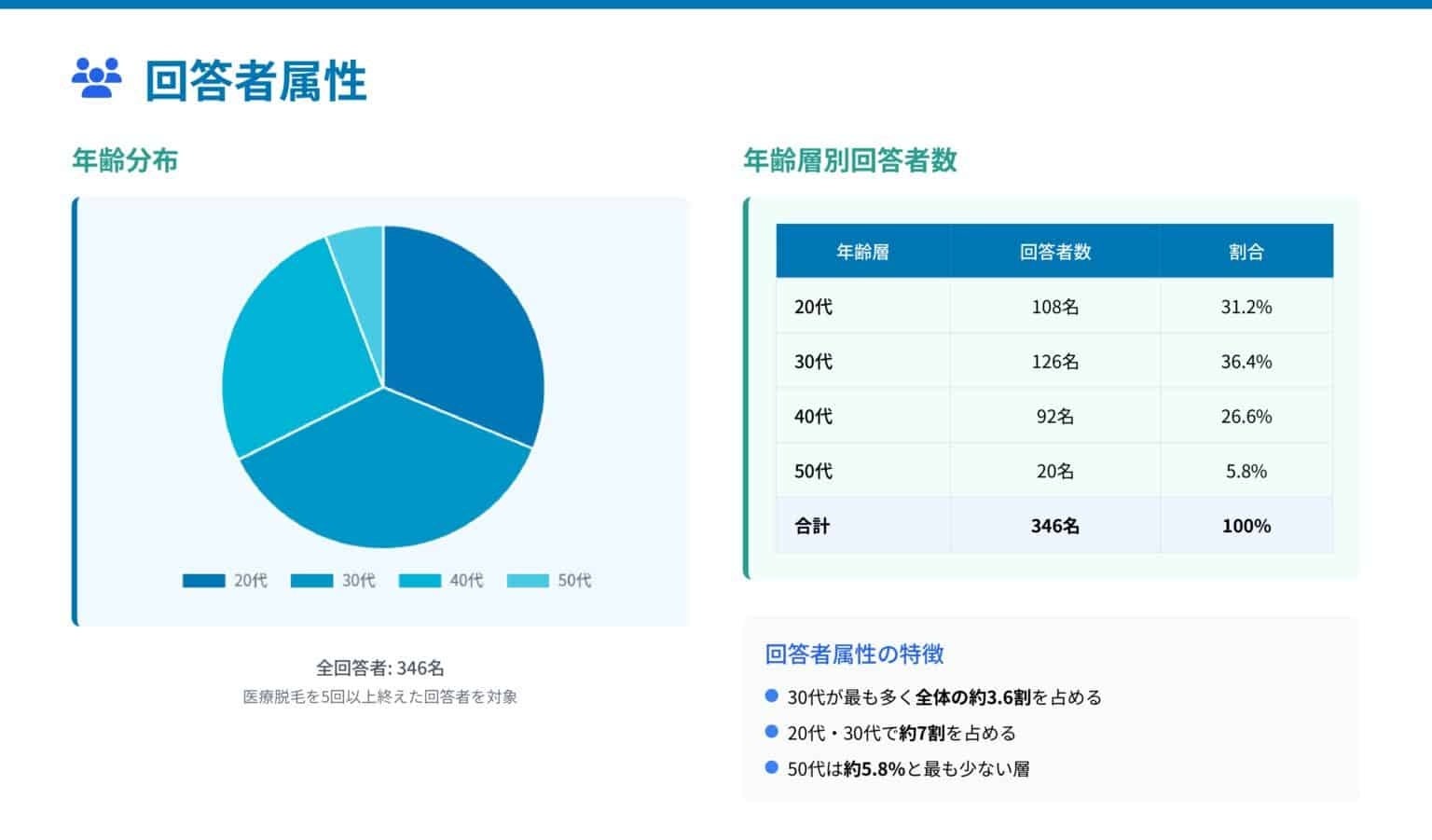 回答者の約7割が20代・30代で、医療脱毛が若年層を中心に定着。一方で40代以上も一定数おり、幅広い年代での需要が確認されました。