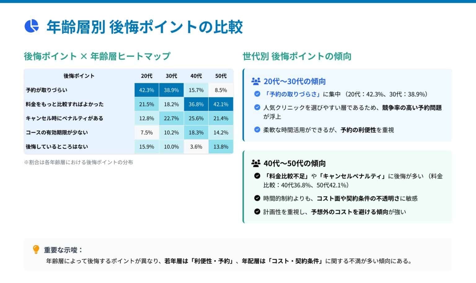 →人気クリニックを選びやすい層であるため、競争率の高い予約問題が浮上。