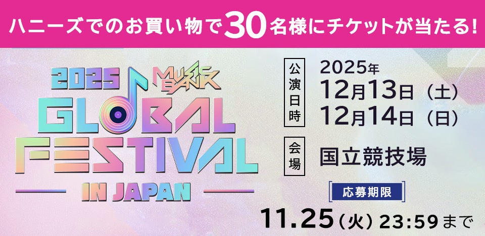 本キャンペーンでは、2025年10月11日(土)から2025年11月25日(火)までの期間中、ハニーズアプリとオンラインショップ会員登録連携のうえ、ハニーズの店舗またはハニーズ公式オンラインショップにて指定金額分ご購入後、キャンペーンサイトからご応募いただくと、「2025 MUSIC BANK GLOBAL FESTIVAL IN JAPAN」のチケットが抽選で30名様に当たります。