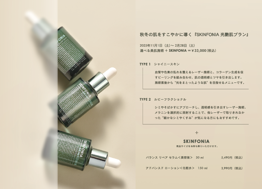 美容施術とスキンケアを組み合わせ、秋冬の肌をすこやかに導く『SKINFONIA 光艶肌(こうえんはだ)プラン』です。