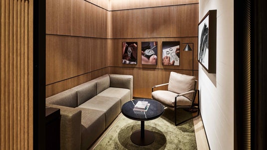 ブティック内はあたたかな色合いのグリーンやウッドウォールに包まれ、落ち着いた佇まいでお寛ぎいただけます。ブティックの奥の ラウンジスペースでは、プライベートな空間で寛ぎながら、コレクションをお楽しみいただけます。