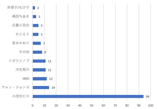 順位は前回と変わらず小田切ヒロさん、IKKOさん、河北裕介さんとなりましたが、1位の小田切ヒロさんは前回(約2年半前)の84票から大きく票を増やし、圧倒的一位に。