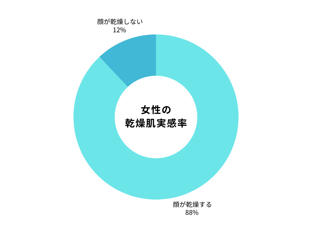 女性全体の約88%が「顔が乾燥する」と回答。「一年中乾燥する」「季節で乾燥が悪化する」を合わせると7割超です。