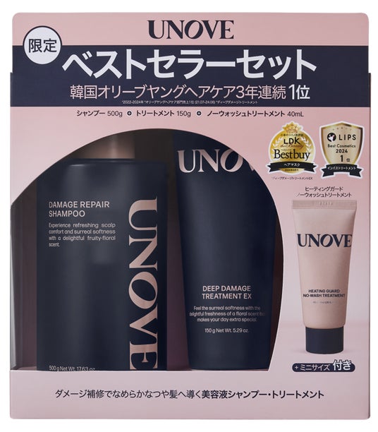 ●LOFT/Shopin限定の「ベストセラーセット」オリーブヤングにてヘアケア部門3年連続1位※3を受賞したディープダメージトリートメントEXと、シャンプー部門2位※4のダメージリペアシャンプーをセットにした特別なセットが全国のLOFT/Shopin限定※5で発売開始!セットには一緒に使うとさらに効果的!乾燥やドライヤーなどの熱ダメージから、髪をしっかり守るヒーティングガードノーウォッシュトリートメントのミニサイズまでついてきます。