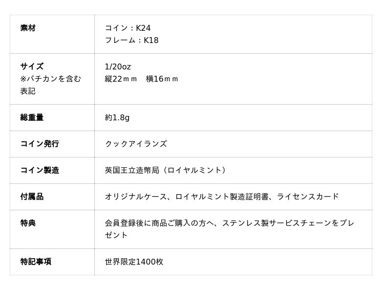 また、本商品に使用されている純金コインは、クックアイランズ政府発行の法定通貨であり、