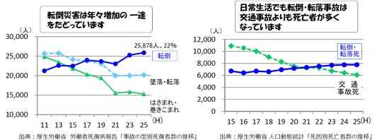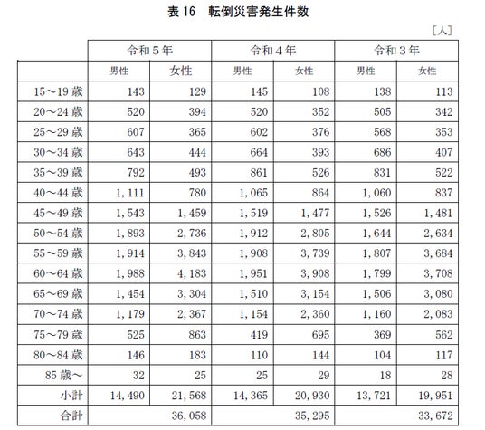 また、近年は事故の種類の中でも最多となっていることにくわえて、40歳以上の男女の転倒災害が急増している状況です。