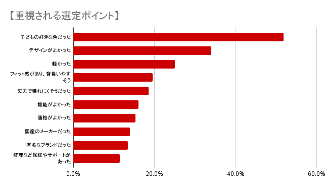 続いて 第2位は「デザイン」クラシックな形状から新しいフォルムまで、機能性だけでなく、子どもが毎日背負いたくなるスタイルかどうかが選定基準になります。
