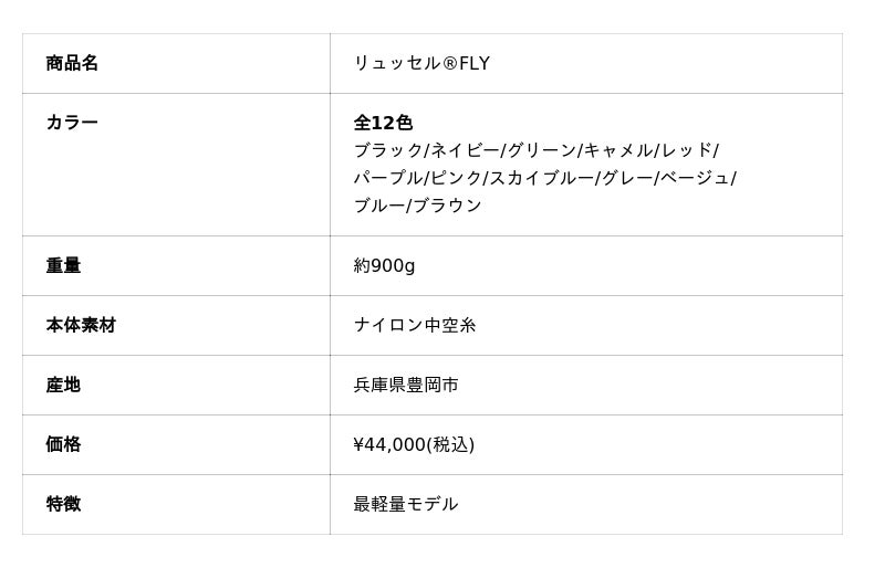 リュッセル(R)︎シリーズの最軽量モデルFLY、重さ約900gと昨年モデルからさらに約25g軽量化されました。リュックに使われる素材「ナイロン中空糸」は従来のナイロン繊維に比べて約 30%軽く、 水に浮くほどの軽さです。