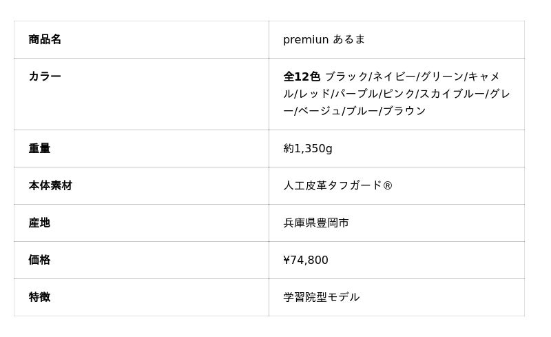 【premium あるま】は、丈夫な人工皮革の機能性と上質な本革の見た目を兼ね備えた学習院型モデル。 TEIJINコードレ社の高機能素材「タフガード(R)」を使用し、本革よりも軽量ながら優れた強度と耐久性を実現しました。