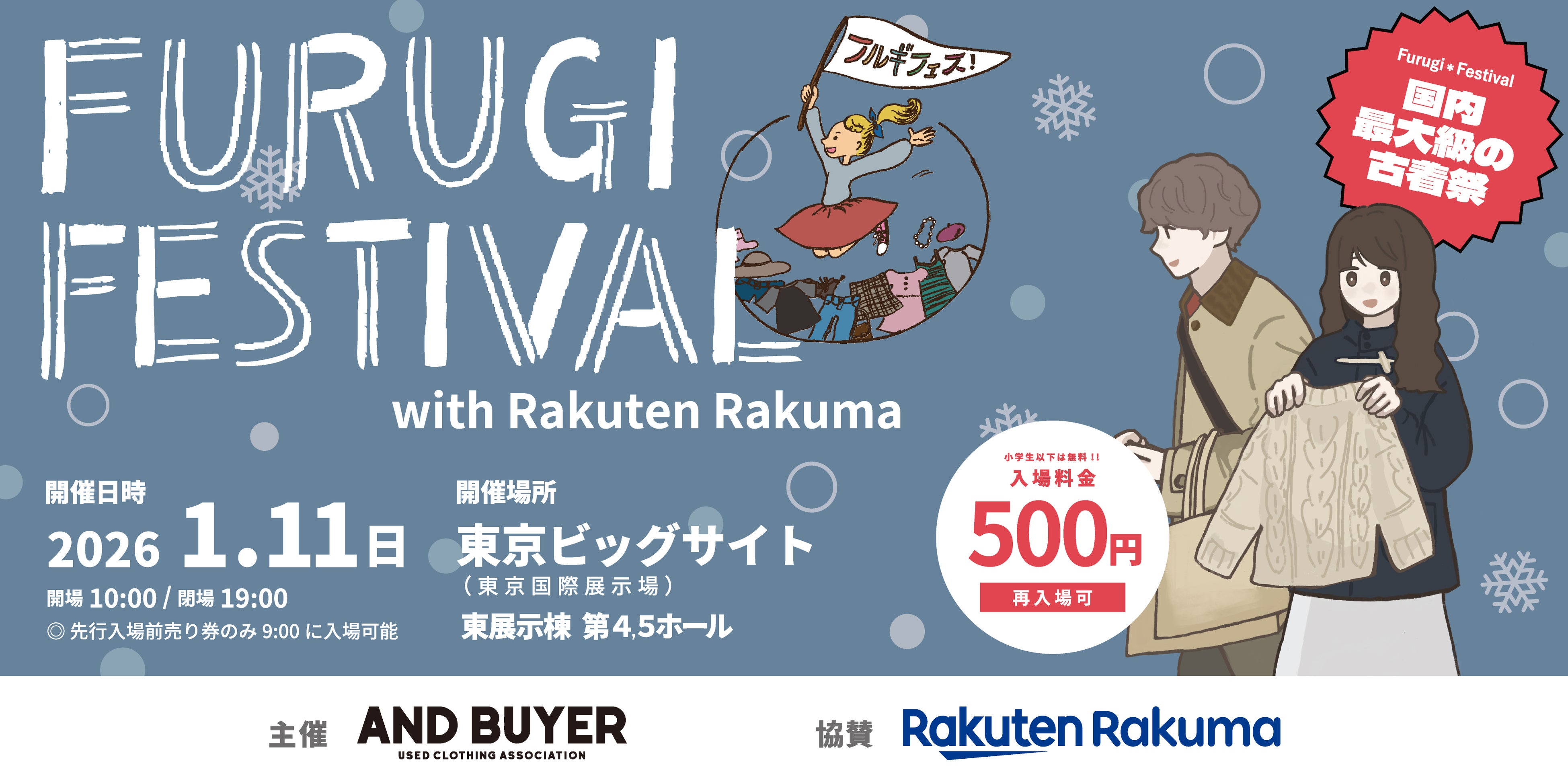 一般社団法人AND BUYER(アンドバイヤー)は、2026年1月11日(日)に東京ビッグサイトで「古着フェス(R) with Rakuten Rakuma」を開催します。2017年に始まった「古着フェス(R)」は今回で10回目を迎え、今や冬の定番イベントとして定着しています。今回は東京ビッグサイト東展示棟4・5ホールの広さ約17000平方メートル (約5150坪)に全国から約300ブース以上の有名ショップから隠れた名店、ネット限定ショップまで勢揃い!リーズナブルな価格帯から貴重なヴィンテージアイテムまで、多彩な古着が並ぶこのイベントは、初心者からコアな古着ファンまで、誰もが楽しめる内容です。さらに、ヴィンテージポスターやブランドアクセサリーなど、古着以外のショップも登場し、幅広い魅力を体感いただけます。先行入場前売り券は11月14日より販売中!