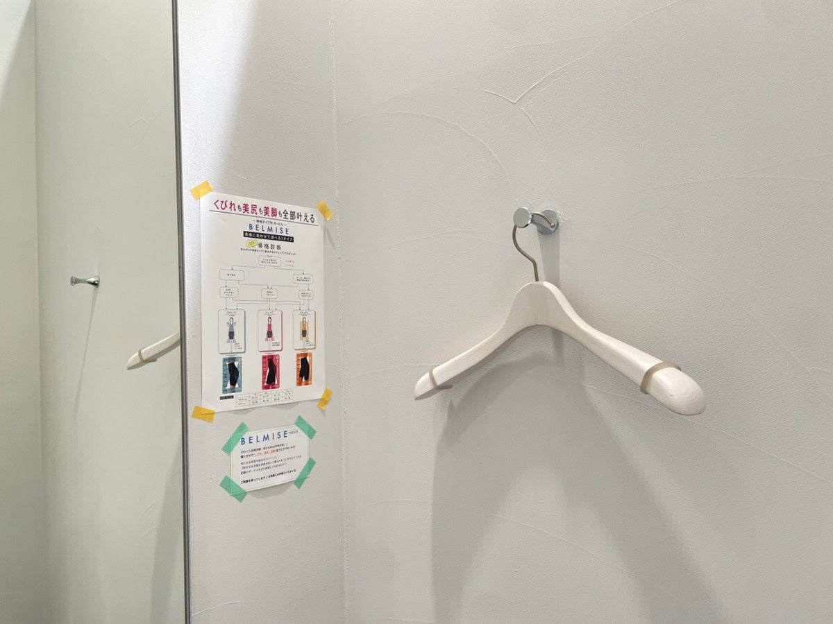 また、今回の取り組みでは商品理解だけでなく試着室空間の改善・整備にも着手しました。特に注力した点は、「試着室で補正効果を即実感できる導線設計」です。具体的には、試着エリアにベルミスのガードルアイテムを手に取ってすぐ試せるよう配置されています。試着室内部には骨格タイプ別診断表 や該当タイプに応じたおすすめアイテムを一覧表示する案内表を設置させていただきました。