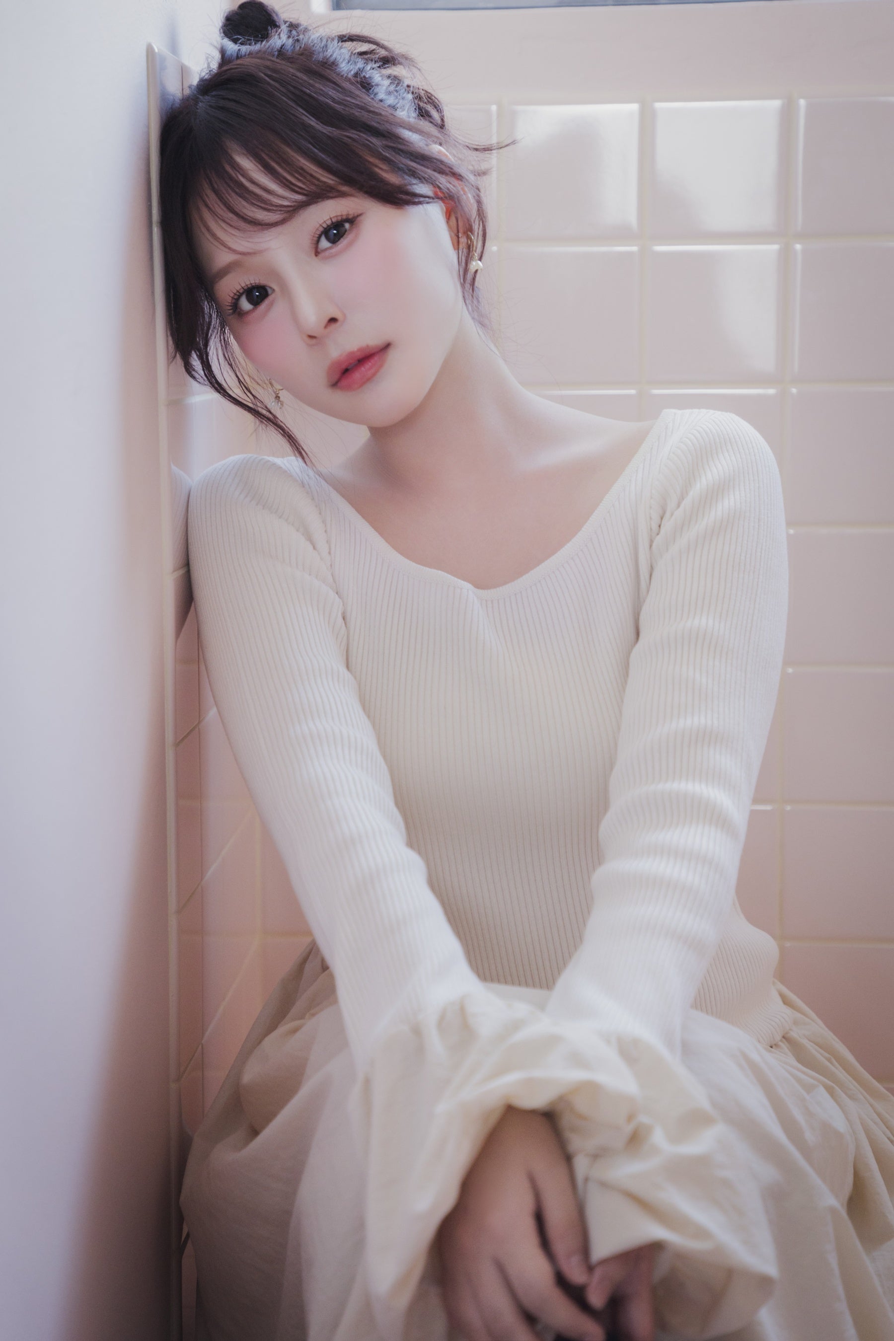 淡い光に包まれた部屋の中で、現実へとゆっくり戻っていく瞬間をスタイリングに落とし込みました。