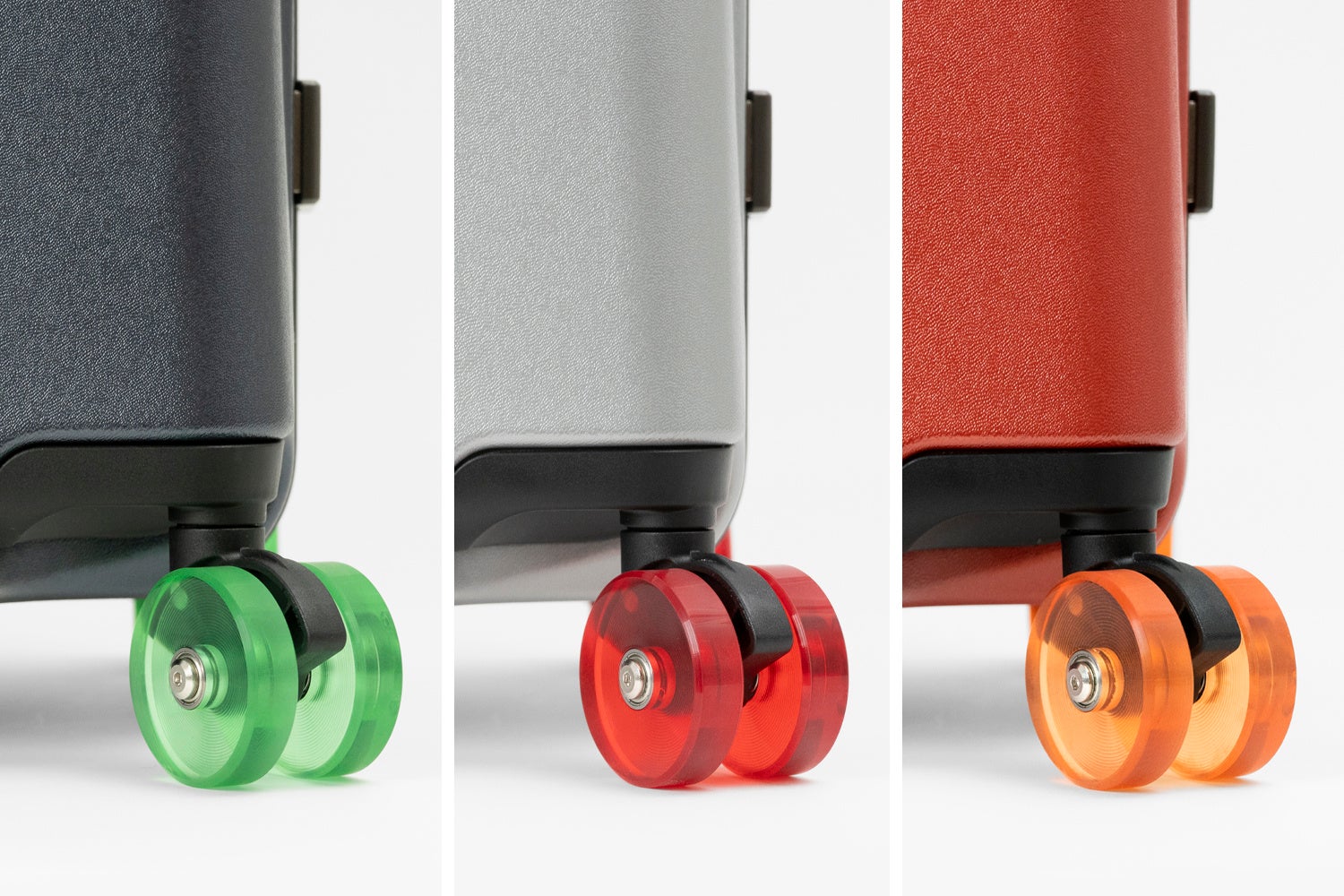 氷のように透き通るクリアな質感のダブルホイールキャスターは、それぞれのボディーカラーとは異なるカラーを取り合わせ、個性が際立つ佇まいを演出します。
