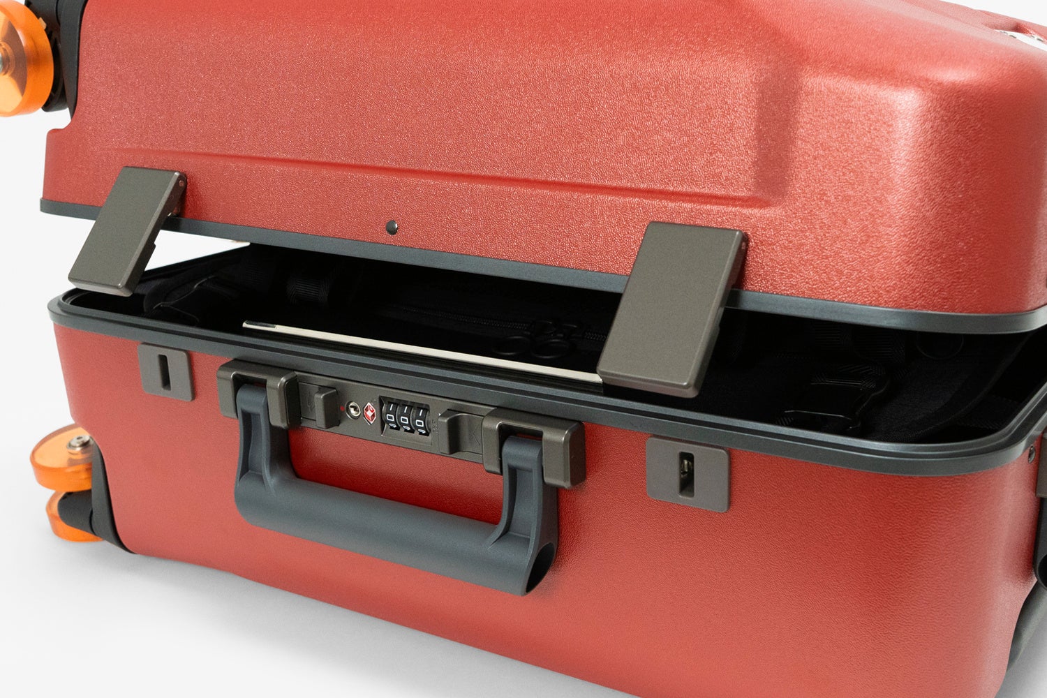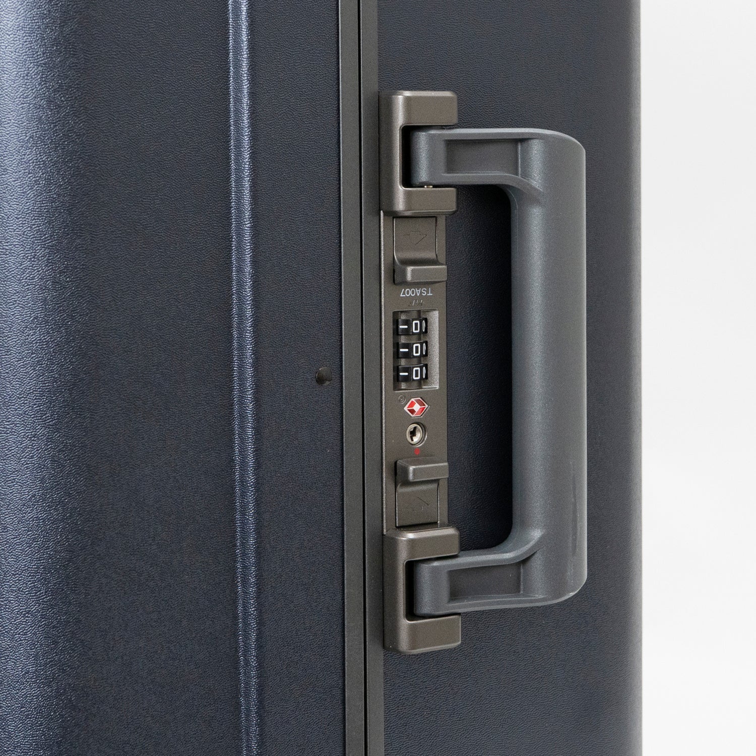 密閉性を強化するラッチ式センターロックは、暗証番号を設定後に中央部両側のスライドボタンをつまむだけでワンタッチでスムーズに開錠が可能。旅先でも快適に使える操作性を備えています。