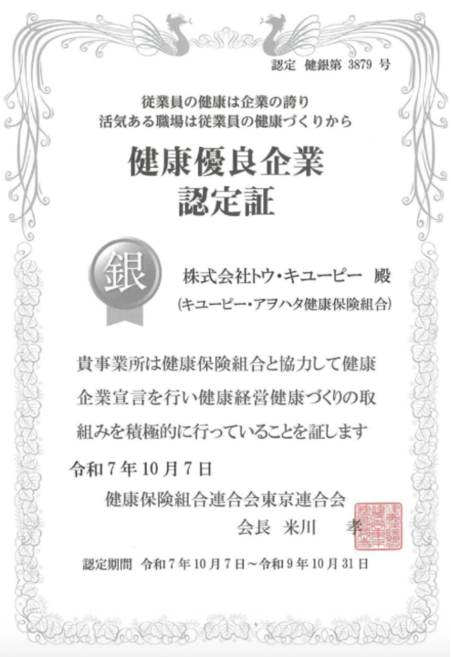 キユーピー株式会社のグループ会社で、キユーピーウエルネスを運営する株式会社トウ・キユーピー(本社:東京都渋谷区、代表取締役社長:谷川和正)は、2025年10月7日付で全国健康保険協会東京支部が実施する「健康企業宣言」において、従業員の健康増進に向けた取り組みが評価され、「健康優良企業 銀の認定」を取得いたしました。