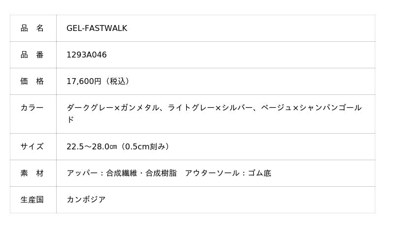 「GEL-FASTWALK」は、時速約5~7kmを目安にした普段より速く歩くことを意識したウォーキングを楽しむ方に向けたモデルです。転がるような感覚を生み出し、ミッドソール(甲被と靴底の間の中間クッション材)の中部がたわむことでエネルギーロスを抑え、効率のよい快適なウォーキングをサポートします。