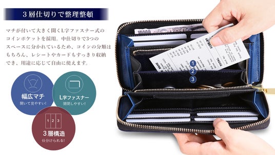 マチが付いて大きく開くL字ファスナー式のコインポケットを採用。中仕切りで3つのスペースに分かれているため、コインの分類はもちろん、レシートやカードもすっきり収納できます。