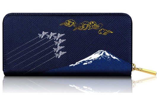 高級絹織物の京都西陣織を日常に。吉兆の雲≪祥雲≫がかかる富士山を背景に、飛翔する6機のブルーインパルス。大空に「夢・感動」を描くアクロバットチームを、美しく染められた色糸で織り上げた特製の長財布です。
