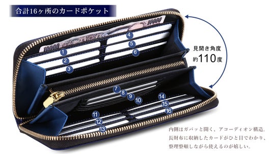 内側はガバッと開く、アコーディオン構造。長財布に収納したカードがひと目でわかり、整理整頓しながら使えるのが嬉しい。