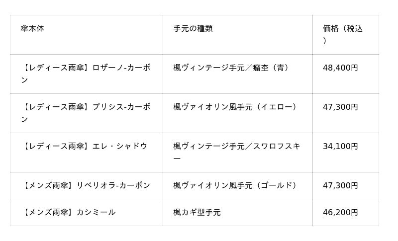 楓は耐久性と加工のしやすさを兼ね備えていることから、傘の手元に最も多く用いられてきた素材です。今回ご紹介するワンランク上の楓製ハンドルは、使用する材質や塗料、加工工程に至るまで従来品とは異なる特別な仕上がりとなっています。原材料の枯渇や作り手が途絶えたことにより、現在では生産できない一点物ばかりを、約40本ご用意いたしました。ぜひ実際にお手に取ってご覧いただき、お好みの一本をじっくりとお選びください。時代を超えた、世界にひとつだけの傘にお仕立ていたします。