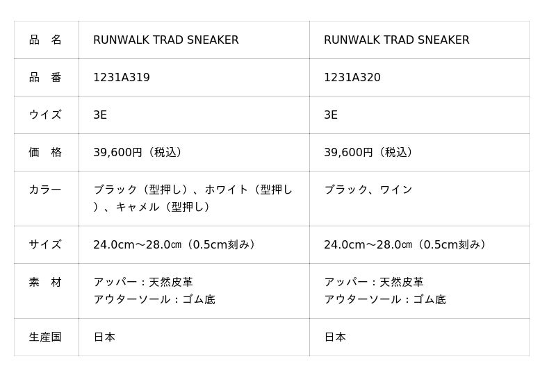 ※同じコンセプトの「RUNWALK TRAD SNEAKER LUX(ランウォーク トラッドスニーカー ラックス)」を2月初旬から順次発売しています。フランス原皮のきめの細かな上質なキップレザーを採用しながら、つま先の飾り穴やハトメ(靴ひもの通し穴)補強のギザ歯などクラシックシューズのディテールを取り入れています。
