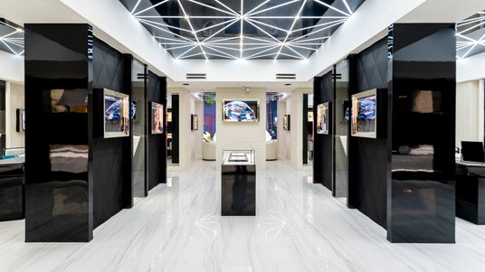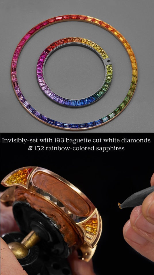 - G-DRAGONのシグネチャーカラーから厳選された152個のレインボーカラーサファイアと193個のバゲットカットのホワイトダイヤモンドを組み合わせ、華やかでダイナミックな輝きを実現。