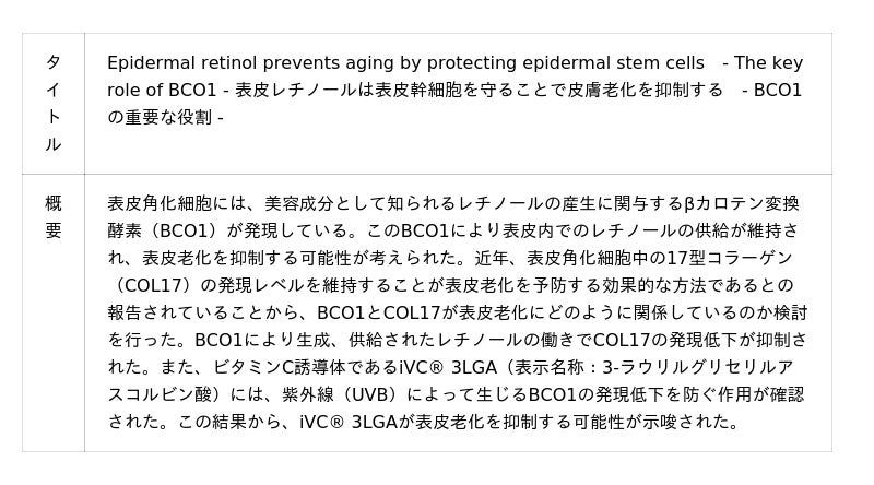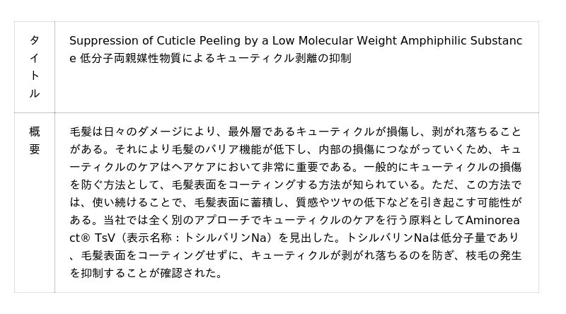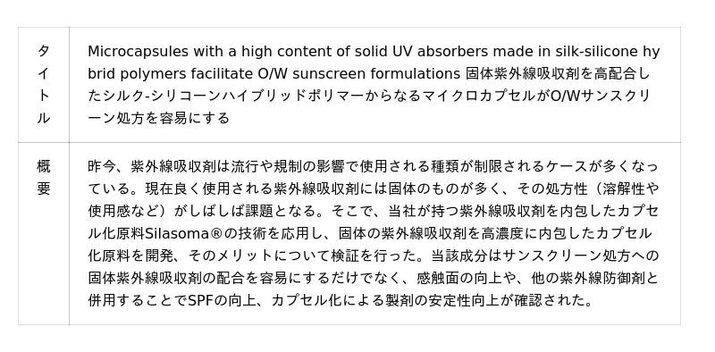 βカロテン変換酵素産生促進による表皮老化の抑制の可能性/毛髪表面のコーティングとは異なるアプローチによる枝毛の発生抑制/固形紫外線吸収剤を高濃度で内包したカプセル化原料のメリット