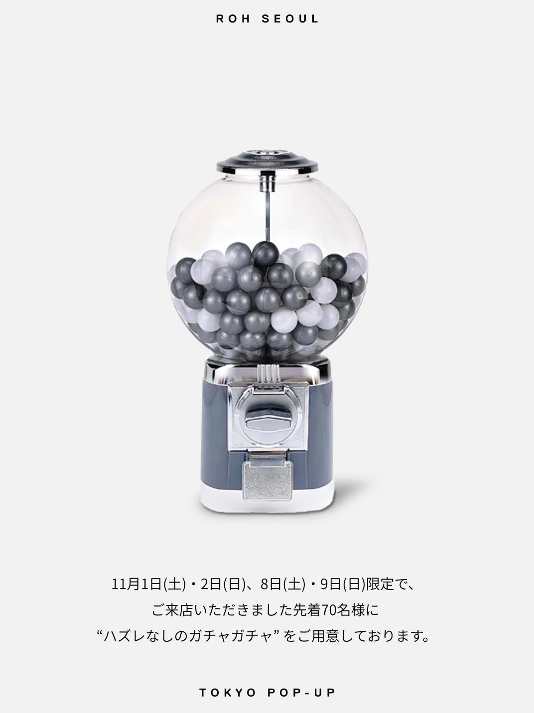土日限定開催!ROH SEOUL 日本公式Instagramをフォローし、フォロー画面をスタッフに提示するとガチャガチャ用コインを1枚プレゼント!アパレルアイテム・アクセサリー・雑貨など豪華アイテムが当たるチャンス!
