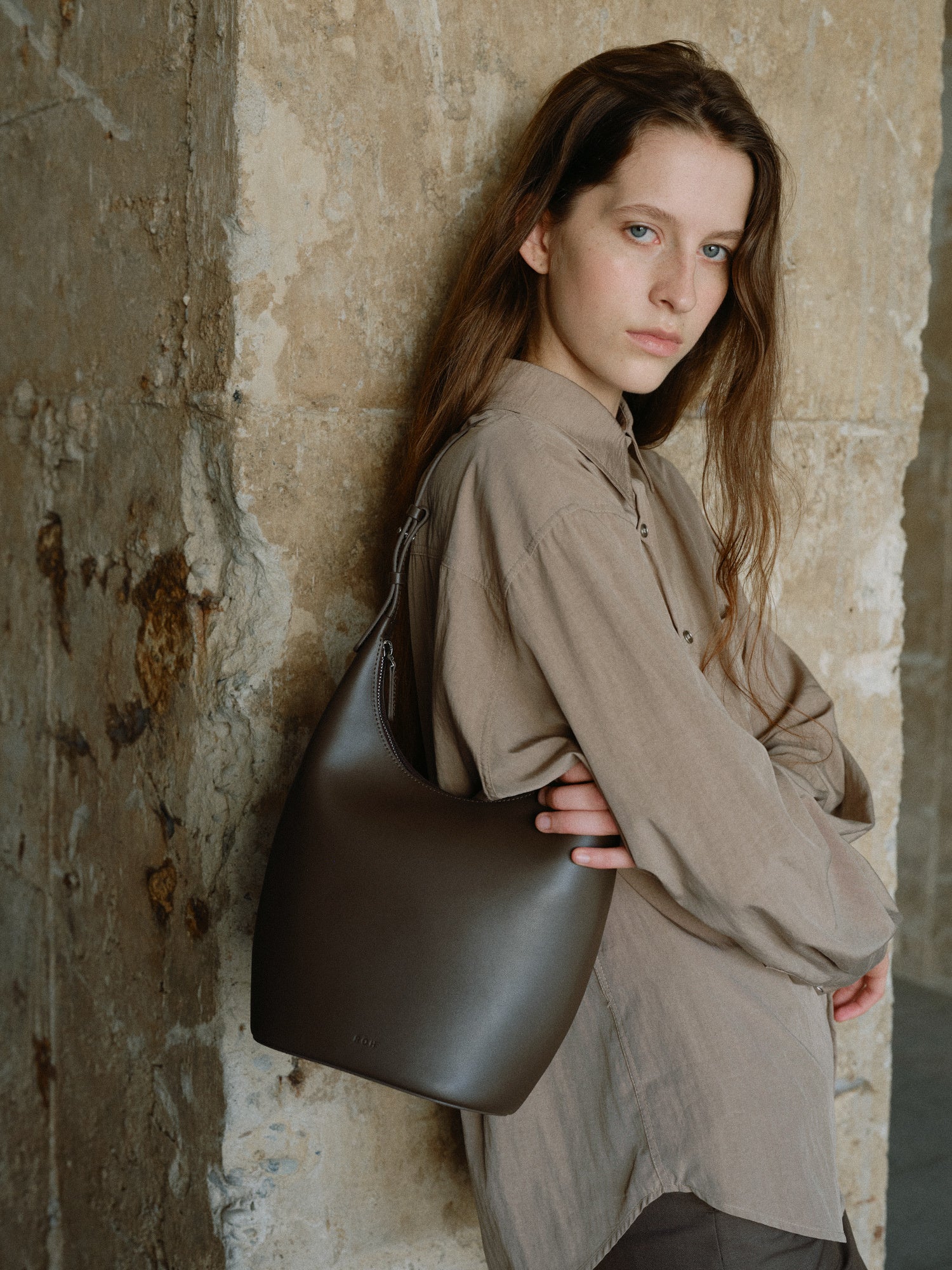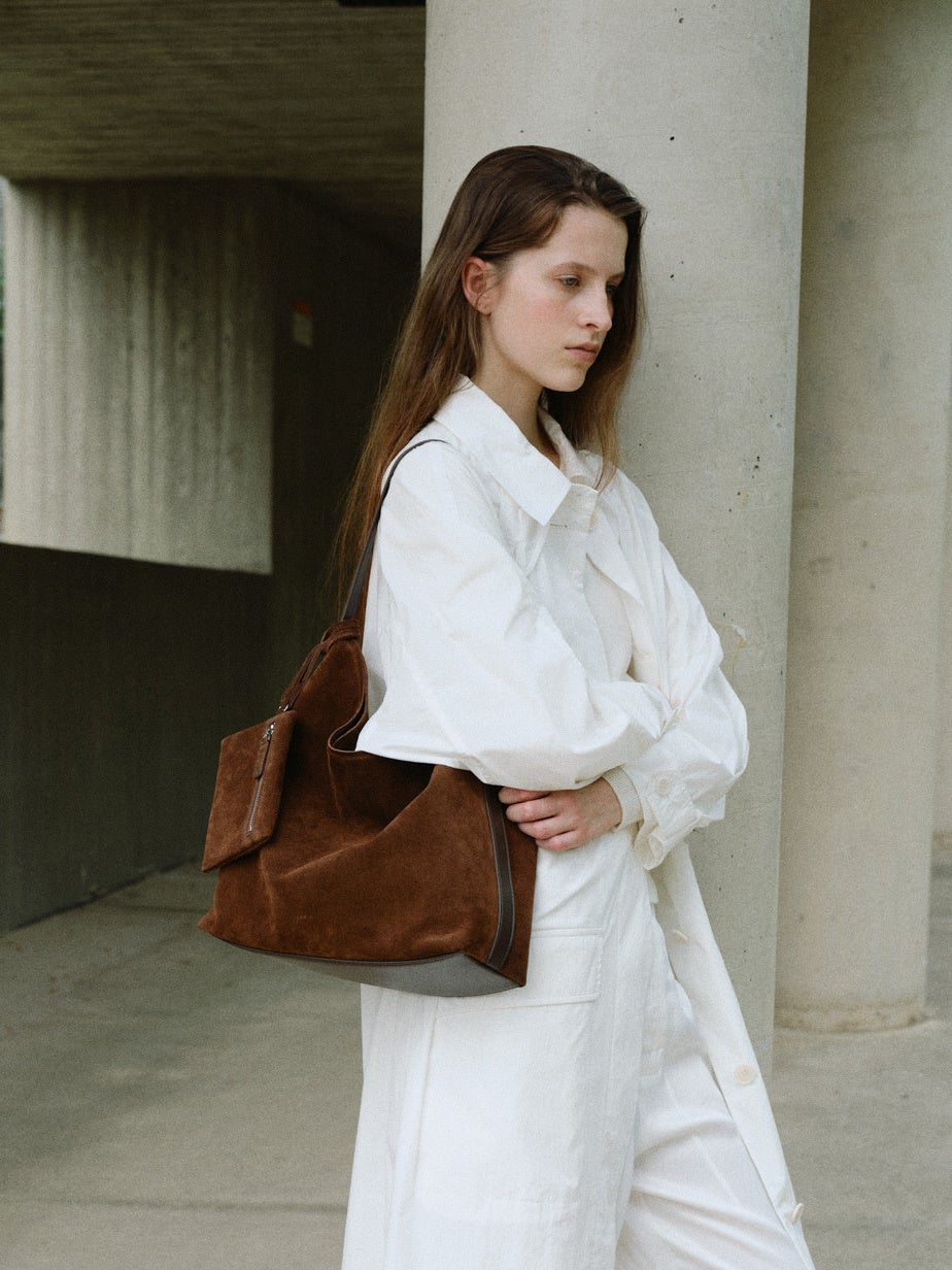 ブランドのシグネチャーアイテムの一つPulpy hobo bagから、秋冬に取り入れたいスエード素材でニュアンスのあるチェストナット(栗)カラーが登場。柔らかくしなやかな質感は使うたびに自然と持ち主のスタイルに馴染みます。今回は小柄なバージョンで人気を博すMini Pulpy hobo bagもご用意。