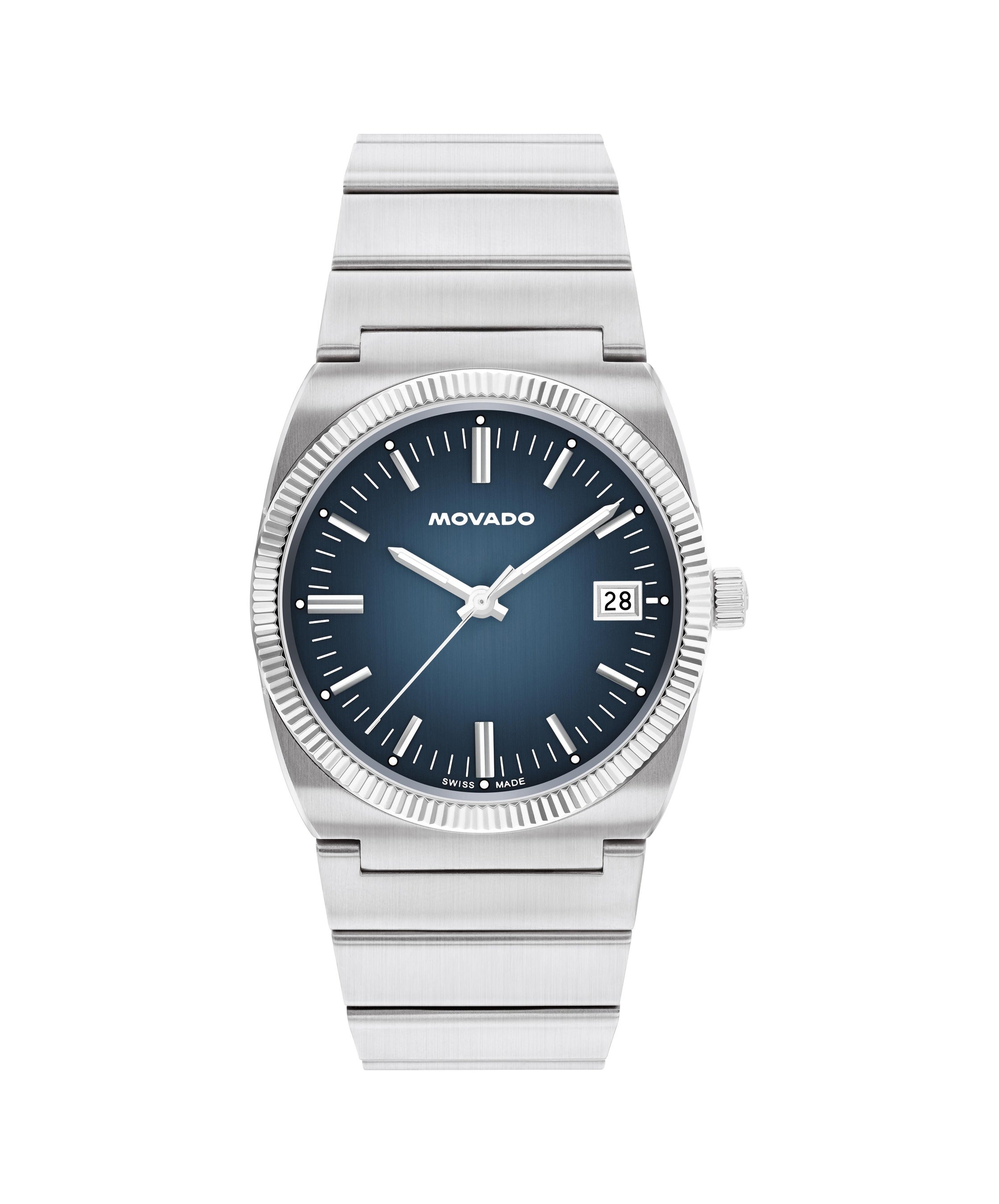 この36mm の時計は、ブルーのグラデーションダイアル、フルーテッドベゼル、ステンレススチールの針を備えています。