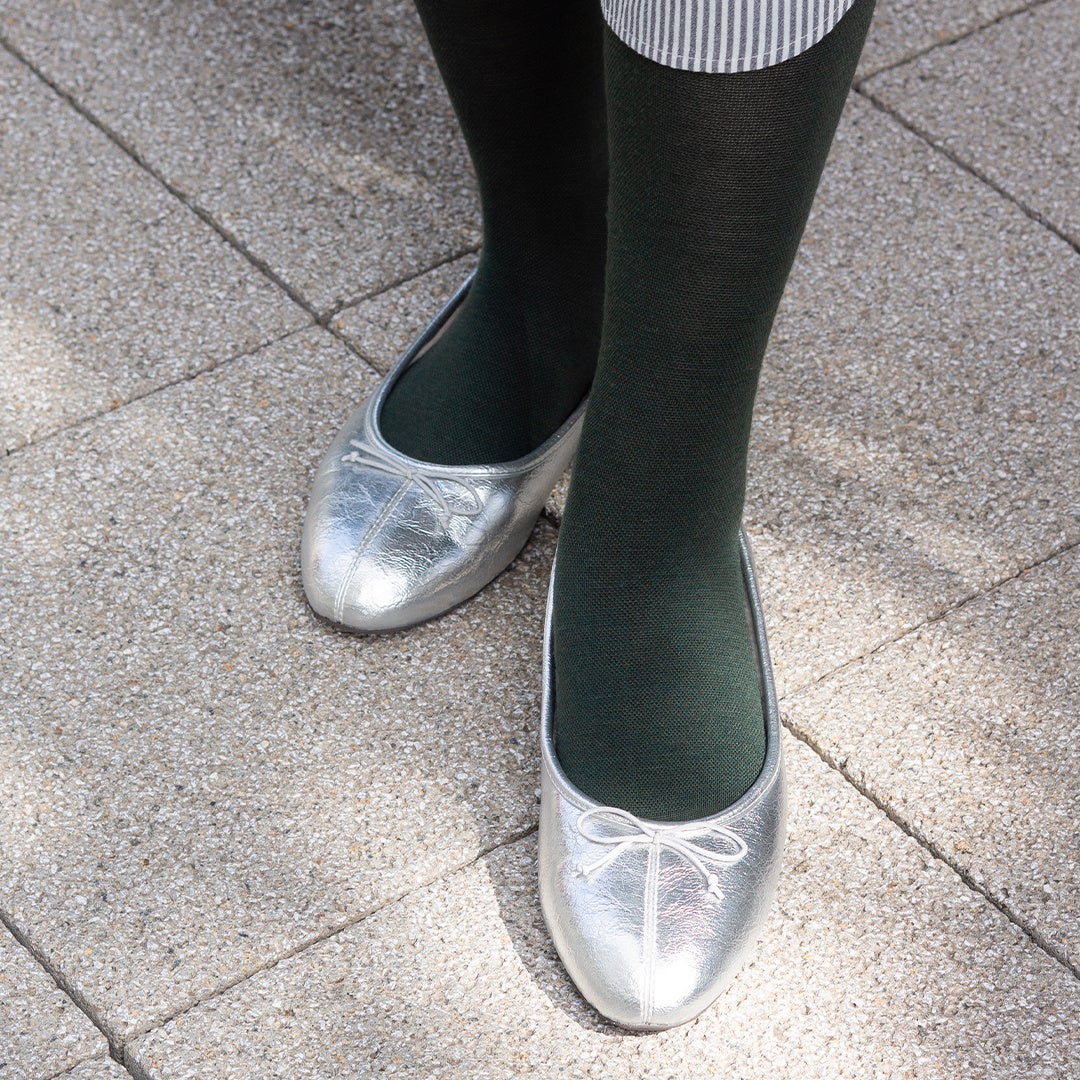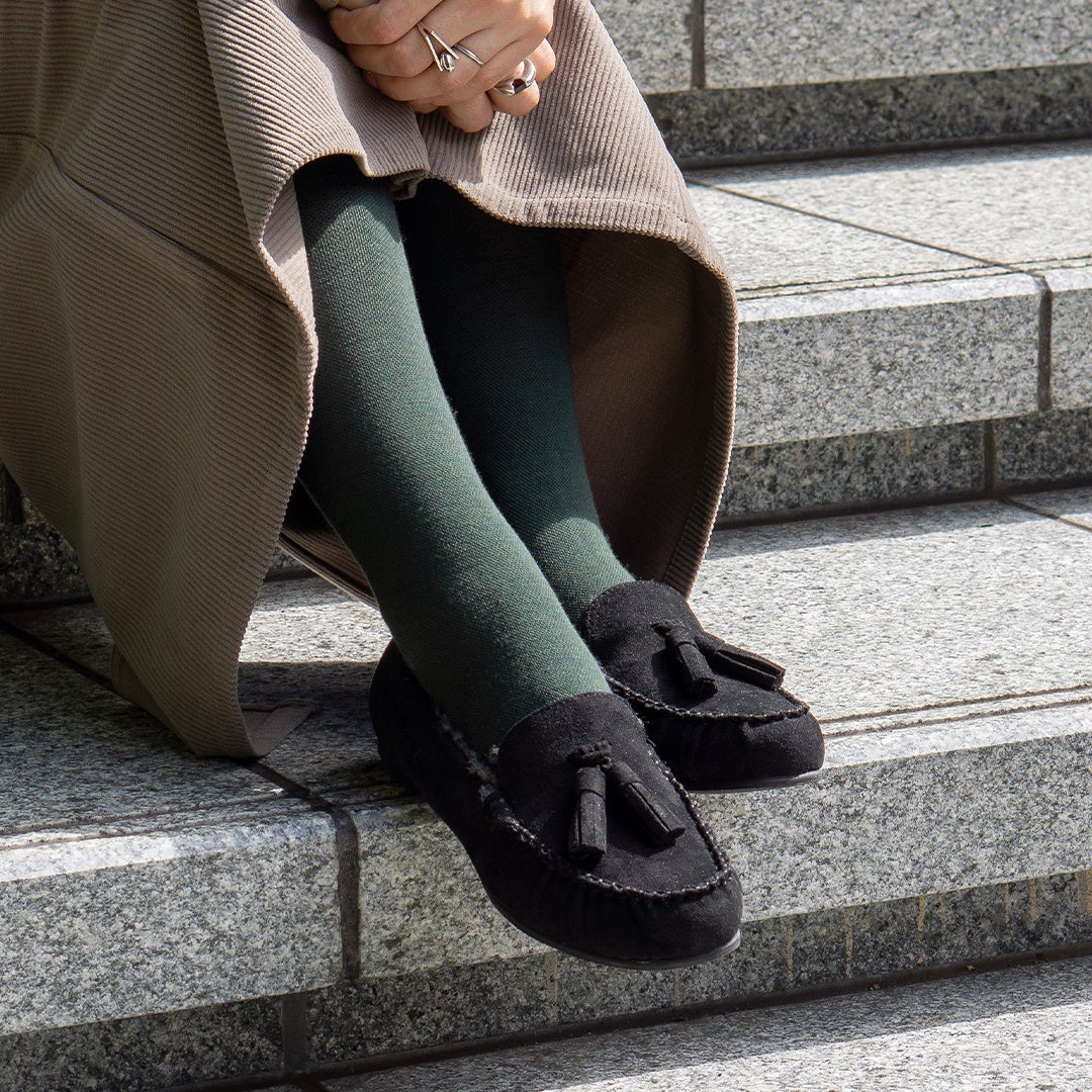 暗くなりがちな冬の足元にニュアンスを与えます。ブラックのコートやボトムスから除く深いグリーンがよいアクセントになります。