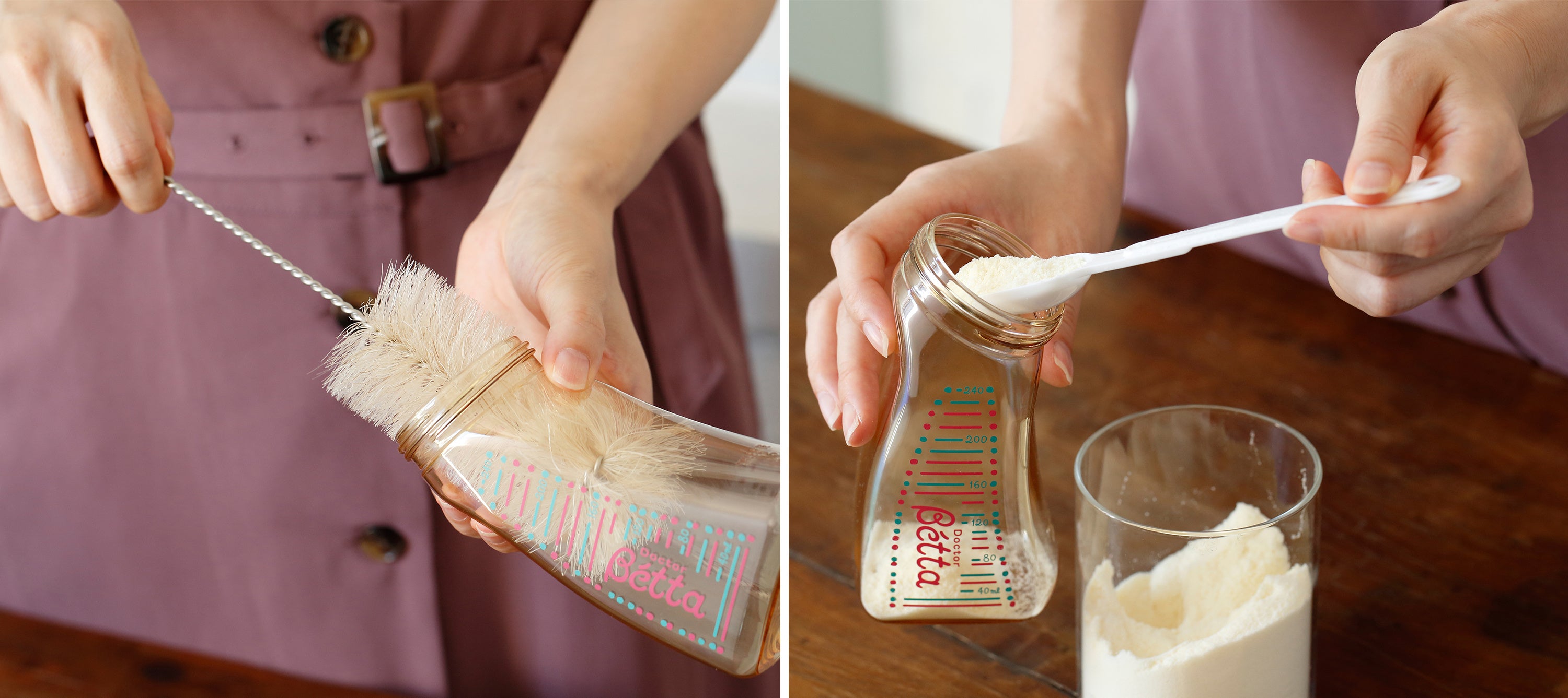 広口タイプは洗いやすく、さらに調乳がしやすく、咥えた時の触感がママのおっぱいにより近い哺乳びん。ぽっちゃりしたカタチで安定感があり倒れにくいため、調乳や授乳中も快適に使用することができます。