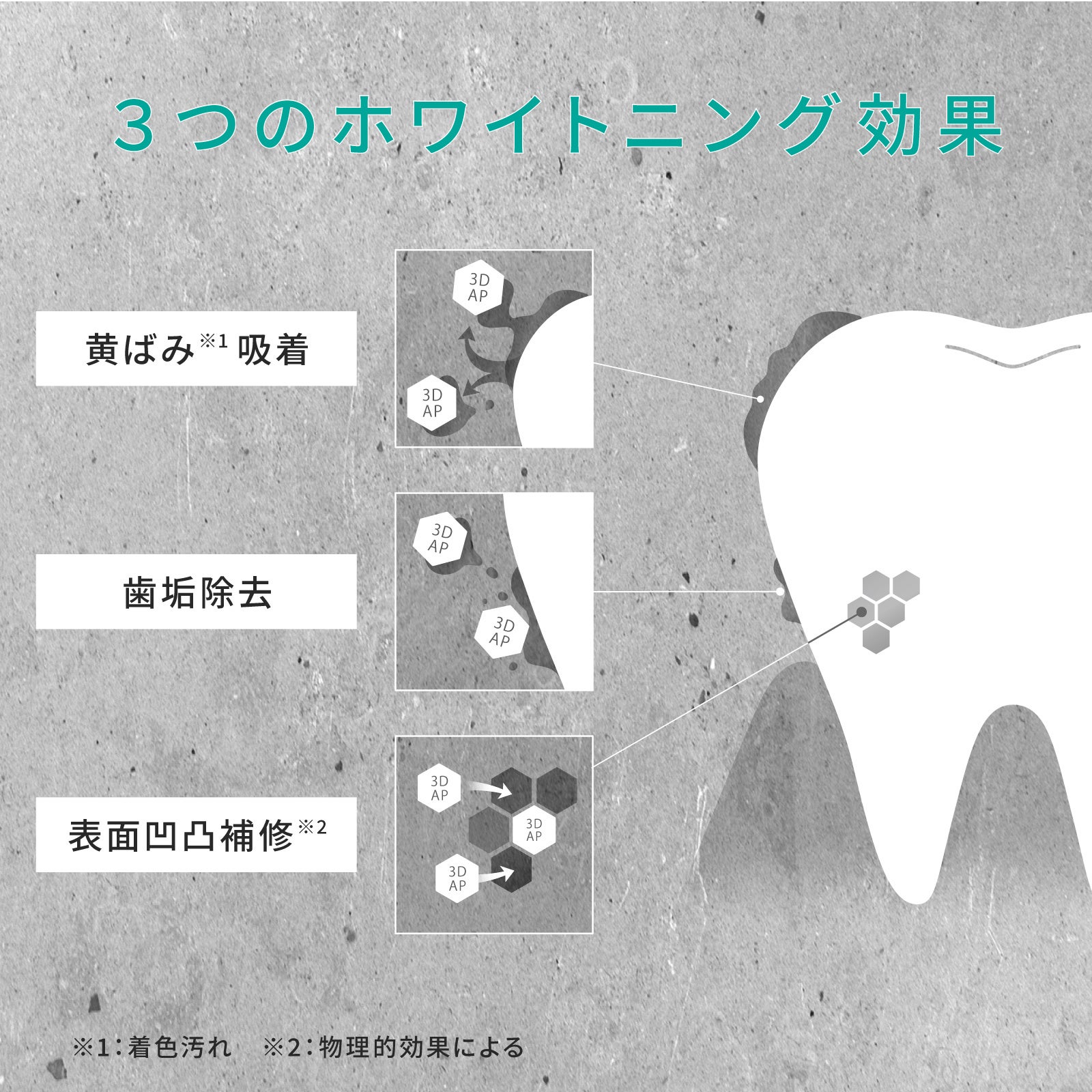 ※物理的効果による *ヒドロキシアパタイト(清掃剤) ・「バイオ3Dアパタイト(R)」は、株式会社エクロールの登録商標です。