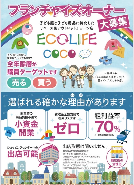 ECOLIFE COCO(エコライフココ)ではフランチャイズオーナーを募集中です。現在、子供用品専門のリサイクルショップで積極的に全国出店を進めている企業があまりなく競争相手が圧倒的に少ない業態です。在庫リスクも少ない簡潔明瞭なシステムでかつ高粗利益の安定な経営をサポートいたします。ご興味をお持ちの方は是非一度お問い合わせください。ECOLIFE COCOと共に全てのママが自然と笑顔になれるお店にチャレンジしませんか?
