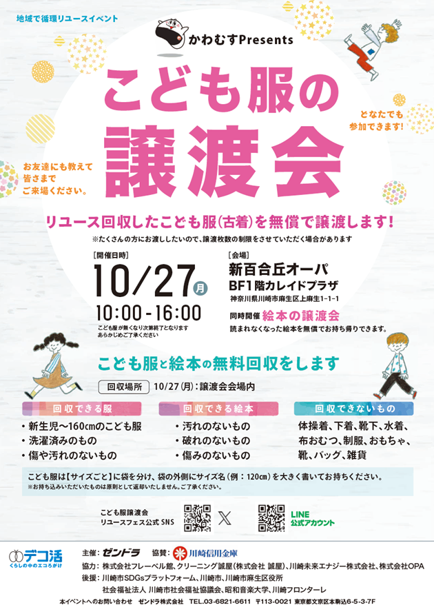 商業施設「新百合丘オーパ」(以下、「当施設」)では、川崎信用金庫の呼び掛けにより、川崎市内の企業、大学、行政、金融、福祉、スポーツの各団体が分野を超えて連携し、『こども服の譲渡会』(以下、「本企画」)を開催いたします。また、併せて『絵本の譲渡会』も同時開催いたします。
