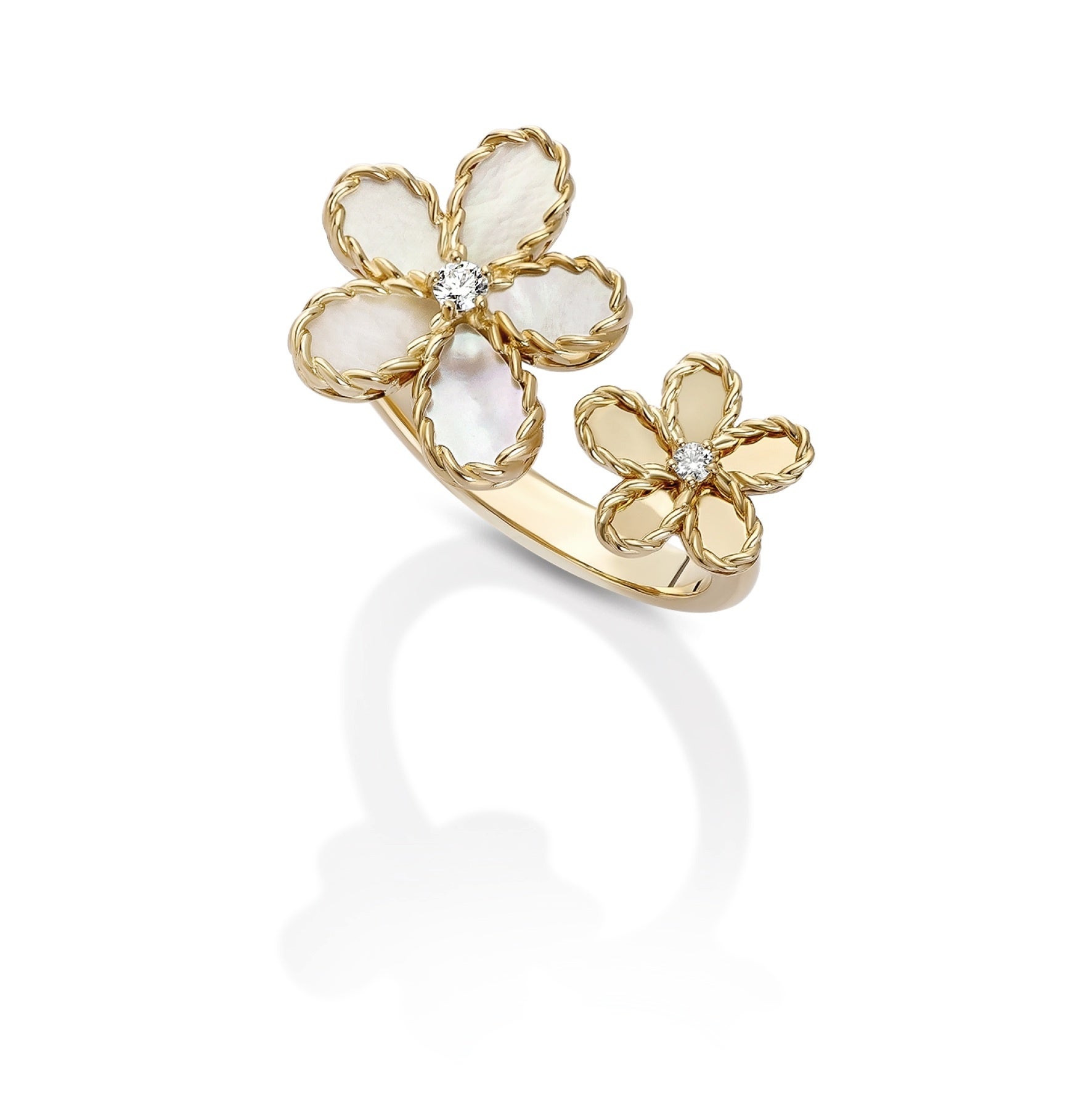 緻密な技術と詩的な美しさが共鳴するデザイン「ジャスミン」コレクションは、花びらを思わせる有機的なフォルムが特徴。マザーオブパールの柔らかで乳白色の艶めきが、花のもつ優しさを表現し、朝露のようなダイヤモンドのきらめきが瑞々しさと透明感を加えます。花びらのサテン仕上げはすべて職人の手作業によって施され、一本一本の彫りの深さや角度までも緻密に設計されています。軽やかなイエローゴールドがコレクション全体を包み込み、ラグジュアリーでありながら、日常にも自然に寄り添う存在感を放ちます。