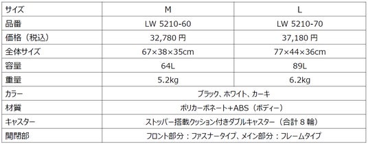 サイズはM・Lの2種類で、価格は3~5泊程度対応のMサイズが32,780円、5~7泊程度対応のLサイズが37,180円(いずれも税込)。カラーは全サイズ、ブラック、ホワイト、カーキの3色展開で、どんなファッションにも馴染みやすいシンプルな色合いとトレンド感のあるボディデザインが魅力です。旅行にビジネスに、どんな場面でも大活躍間違いなしの『LW5210』は、入社・入学など、この春新たな旅立ちを迎える大切な人への贈り物にもマッチする一品です。