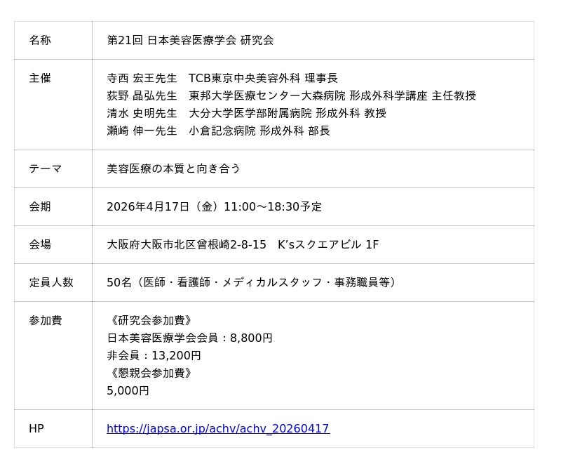 JAPSAは4月17日(金)に第21回 日本美容医療学会 研究会「美容医療の本質と向き合う」の開催を予定しております。